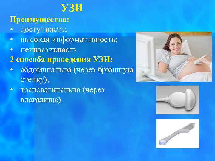 УЗИ Преимущества: • доступность; • высокая информативность; • неинвазивность 2 способа проведения УЗИ: • абдоминально (через брюшную стенку), • трансвагинально (через влагалище).