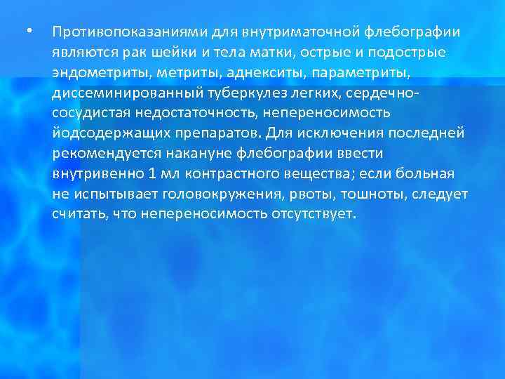 • Противопоказаниями для внутриматочной флебографии являются рак шейки и тела матки, острые и подострые эндометриты, аднекситы, параметриты, диссеминированный туберкулез легких, сердечно сосудистая недостаточность, непереносимость йодсодержащих препаратов. Для исключения последней рекомендуется накануне флебографии ввести внутривенно 1 мл контрастного вещества; если больная не испытывает головокружения, рвоты, тошноты, следует считать, что непереносимость отсутствует.