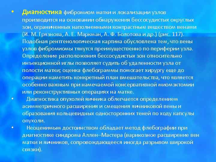 • • • Диагностика фибромиом матки и локализации узлов производится на основании обнаружения бессосудистых округлых зон, ограниченных наполненными контрастным веществом венами (И. М. Грязнова, А. Е. Маркман, А. Ф. Болотова и др. ) (рис. 117). Подобная рентгенологическая картина обусловлена тем, что вены узлов фибромиомы тянутся преимущественно по периферии узла. Определение расположения бессосудистых зон относительно инъекционной иглы позволяет судить об удаленности узла от полости матки; оценка флебограммы помогает хирургу еще до операции наметить конкретный план вмешательства, что является особенно важным при намечаемой консервативной миомэктомии или реконструктивных операциях на матке. Диагностика опухолей яичника облегчается определением асимметричного расширения и смещения яичниковой вены и образования кольцевидных односторонних теней по ходу капсулы опухоли. Неоценимым достоинством обладает метод флебографии при диагностике синдрома Аллен–Мастера (варикозное расширение вен матки и яичников, сопровождающееся иногда разрывом широкой связки).