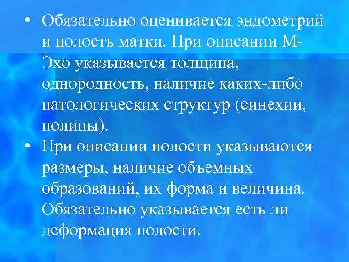 • Обязательно оценивается эндометрий и полость матки. При описании МЭхо указывается толщина, однородность, наличие каких-либо патологических структур (синехии, полипы). • При описании полости указываются размеры, наличие объемных образований, их форма и величина. Обязательно указывается есть ли деформация полости.