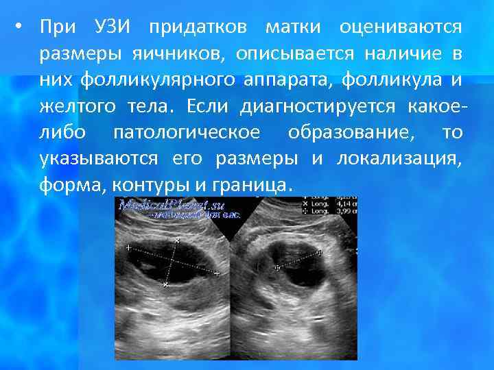 • При УЗИ придатков матки оцениваются размеры яичников, описывается наличие в них фолликулярного аппарата, фолликула и желтого тела. Если диагностируется какое либо патологическое образование, то указываются его размеры и локализация, форма, контуры и граница.