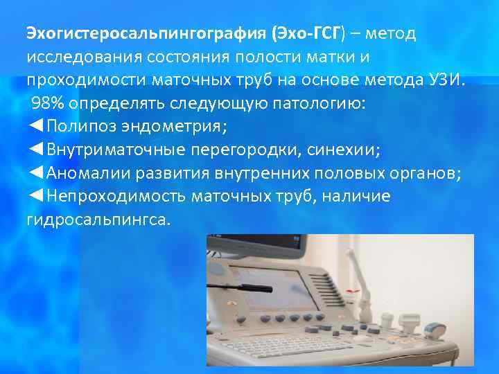 Эхогистеросальпингография (Эхо-ГСГ) – метод исследования состояния полости матки и проходимости маточных труб на основе метода УЗИ. 98% определять следующую патологию: ◄Полипоз эндометрия; ◄Внутриматочные перегородки, синехии; ◄Аномалии развития внутренних половых органов; ◄Непроходимость маточных труб, наличие гидросальпингса.