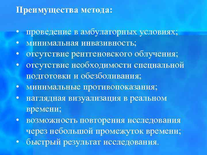 Преимущества метода: • • проведение в амбулаторных условиях; минимальная инвазивность; отсутствие рентгеновского облучения; отсутствие необходимости специальной подготовки и обезболивания; минимальные противопоказания; наглядная визуализация в реальном времени; возможность повторения исследования через небольшой промежуток времени; быстрый результат исследования.