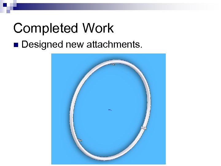 Completed Work n Adapt 1 st Prototype. ¨ Decreased from 6 attachments to 3. ¨ Handrim still too rigid; no noticable difference. n Decided to redesign attachments and implement new bridge circuit.