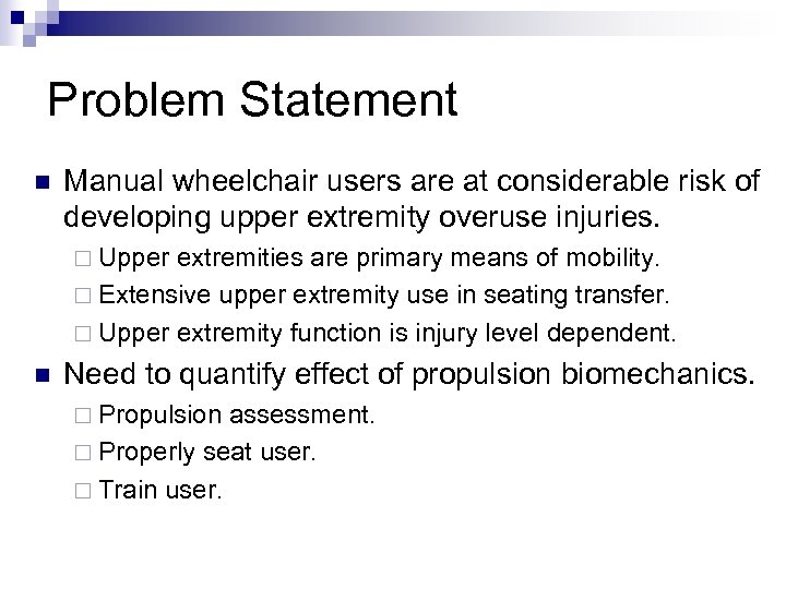 Problem Statement n Manual wheelchair users are at considerable risk of developing upper extremity overuse injuries. ¨ Upper extremities are primary means of mobility. ¨ Extensive upper extremity use in seating transfer. ¨ Upper extremity function is injury level dependent. n Need to quantify effect of propulsion biomechanics. ¨ Propulsion assessment. ¨ Properly seat user. ¨ Train user.