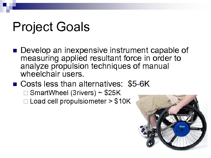 Project Goals n n Develop an inexpensive instrument capable of measuring applied resultant force in order to analyze propulsion techniques of manual wheelchair users. Costs less than alternatives: $5 -6 K ¨ Smart. Wheel (3 rivers) ~ $25 K ¨ Load cell propulsiometer > $10 K