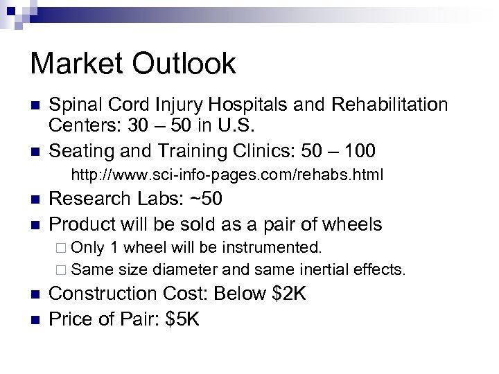 Market Outlook n n Spinal Cord Injury Hospitals and Rehabilitation Centers: 30 – 50 in U. S. Seating and Training Clinics: 50 – 100 http: //www. sci-info-pages. com/rehabs. html n n Research Labs: ~50 Product will be sold as a pair of wheels ¨ Only 1 wheel will be instrumented. ¨ Same size diameter and same inertial effects. n n Construction Cost: Below $2 K Price of Pair: $5 K