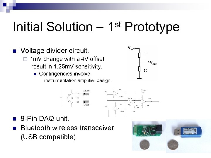 Initial Solution – 1 st Prototype n Voltage divider circuit. ¨ 1 m. V change with a 4 V offset result in 1. 25 m. V sensitivity. n Contingencies involve instrumentation amplifier design. n n 8 -Pin DAQ unit. Bluetooth wireless transceiver (USB compatible) T C