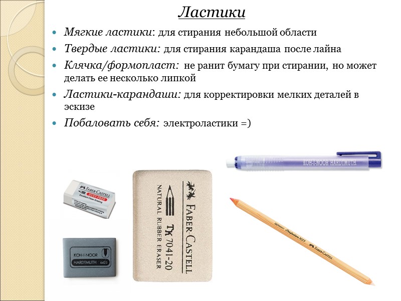 Ластики Мягкие ластики: для стирания небольшой области Твердые ластики: для стирания карандаша после лайна Клячка/формопласт: не ранит бумагу при стирании, но может делать ее несколько липкой Ластики-карандаши: для корректировки мелких деталей в эскизе Побаловать себя: электроластики =)