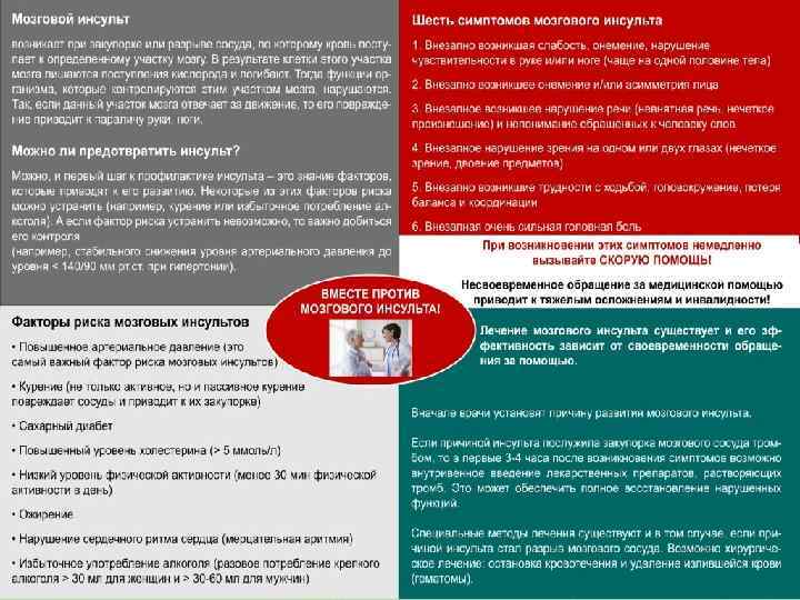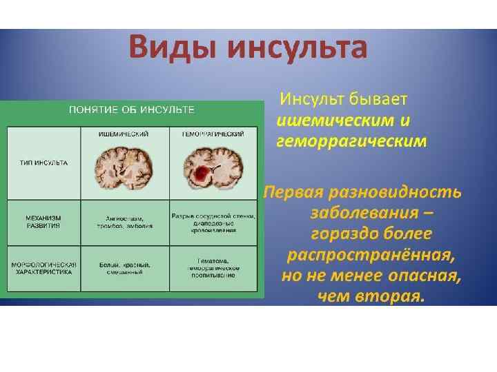 Инсульт — острое нарушение мозгового кровообращения (ОНМК), характеризующееся внезапным (в течение нескольких минут, часов) появлением очаговой и/или общемозговой неврологической симптоматики, которая сохраняется более 24 часов или приводит к смерти больного в более короткий промежуток времени вследствие цереброваскулярной патологии. Ишемический инсульт — острое нарушение мозгового кровообращения с повреждением ткани мозга, нарушением его функций вследствие затруднения или прекращения поступления крови к тому или иному отделу. Сопровождается размягчением участка мозговой ткани —инфарктом мозга. Геморрагический инсульт – это кровоизлияние в мозг в результате разрыва сосудов под действием высокого артериального давления. В переводе с латыни, инсульт означает «удар» , корень гемо означает кровь