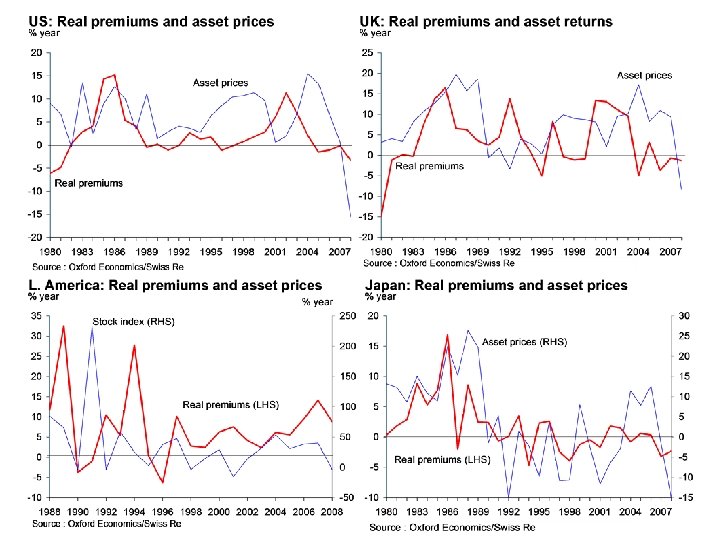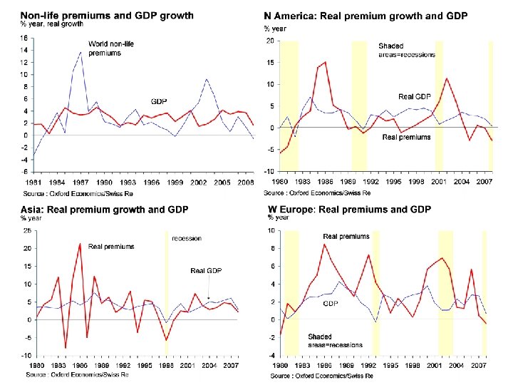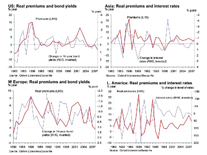 Insurance premiums and macroeconomic factors l A number of macroeconomic factors influence the growth of insurance premiums ■ Economic growth – world real premiums have grown broadly in line with real GDP growth since the early 1980 s. There are considerable differences between regions, however. Premium growth is generally slower in the advanced industrialised countries and more in line with economic growth. In emerging markets, premium growth has generally been faster than average GDP growth, reflecting the ‘catch up’ of these more immature insurance markets. Rapid growth in emerging Europe and Latin America has contributed to faster overall growth in world premiums since the late 1990 s. In recessions, premium growth normally dips, but there can be exceptions, such as 2001. ■ Interest rates – the interest rate cycle is an important influence on real premium growth. Rising bond yields tend to depress premium growth, especially in the mature industrialised countries, whereas periods of rapidly falling rates have been associated with faster premium growth. ■ Asset prices – the rate of growth of asset prices can also be an influence on premium growth, as it impacts the growth of important submarkets such as housing markets. In the industrialised countries, premium growth tends to be more closely correlated with interest rates than asset prices. But Japan in the 1990 s showed that a prolonged period of weak asset prices can have a marked depressive effect on real premium growth.