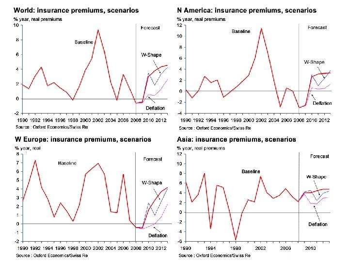 Insurance premiums - pricing l In our baseline scenario prices fall back in 2010 as asset markets recover, further improving investment returns and reducing the incentive for firms to exit the industry - thus maintaining strong competitive pressures. Further downward pressure is visible in 2011 -2012. l In a W-Shaped scenario, prices initially fall faster than in the baseline, as interest rates rise faster and equity markets recover more quickly, but as equity markets stagnate and interest rates fall again later in the forecast period, upward pressure on prices re-emerges. l In a deflation scenario, featuring low interest rates and depressed asset prices, we would expect insurance premiums to come under upward pressure in 2010 -2011 with a significant reduction in industry capacity and competitive pressures. There might also be sector-specific upward pressures, e. g. concerning sectors especially at risk of insolvency/default.