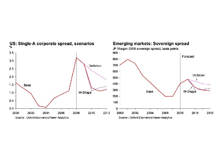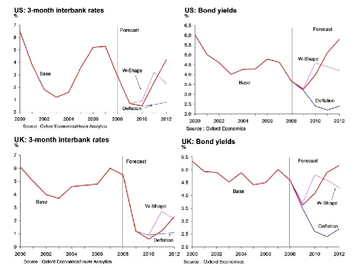 Global interest rates l Central banks have maintained short term rates at very low levels for most of 2009. An easing of financial stress and heavy provision of liquidity by central banks has also led to the spread between interbank and central bank rates dropping significantly, to close to ‘normal’ levels. l Corporate bond spreads have narrowed sharply from the extreme levels seen earlier this year, but remain well above pre-crisis levels. l Government bond yields initially dropped after the announcement of large asset purchase schemes by central banks, but have subsequently rebounded thanks to improved risk appetite linked to the world economy bottoming out. Going forward, the tailing off of asset purchase schemes and large fiscal deficits is likely to push bond yields up further. l Emerging market bond yields have dropped sharply from their late 2008 peaks as capital outflows have eased in line with lower global financial stress and resilient growth in a number of key emergers. l Scenarios – in the deflation scenario, short term rates remain low and credit spreads wide for an extended period. In the ‘W-Shape’ scenario rates initially rise faster than in the base and spreads narrow faster, but rates are falling/spreads widening again by the end of the forecast period.