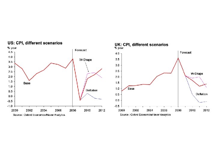 Deflation scenario • Slide into deflation as monetary policy proves ineffective – consumers and businesses delay purchases. • Banking sector remains hobbled by bad loans, falling collateral values. • Extended recession with interest rates remaining very low for a lengthy period. Similar to Japan in the 1990 s.