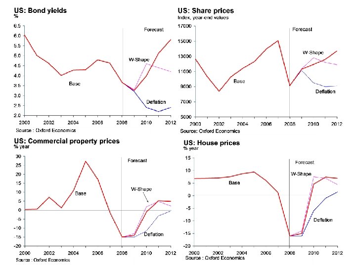 Asset prices under different scenarios l Deflation: ■ Share prices fall back again in 2010 on weak growth, depressed corporate profitability and a badly impaired financial sector. The recovery from 2011 is slow across countries as the world remains mired in a low-growth trap, profitability is weak, and monetary growth is anaemic. ■ Bonds: yields keep on falling into 2011 as deflation takes hold, short rates remain at very low levels, and investors prefer to hold ‘safe’ assets in their portfolios. ■ Property returns are very poor, especially in the UK. Commercial property weakens markedly as economic growth slows sharply. An elongated disruption of credit markets stifles the supply of mortgage credit and delays the recovery of housing markets despite very low interest rates.