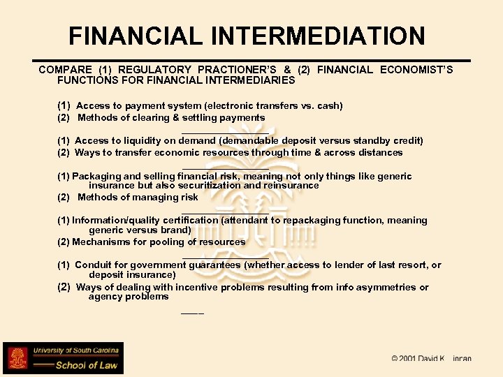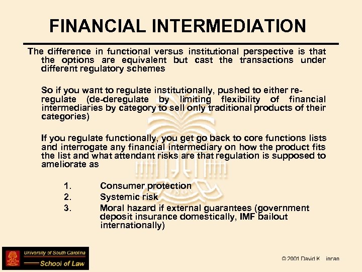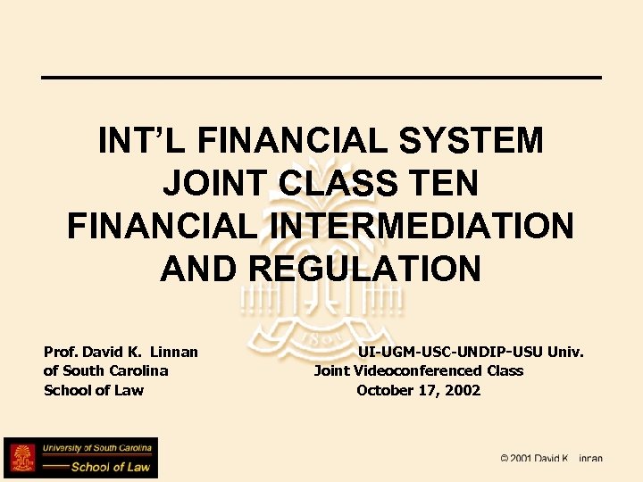 INT’L FINANCIAL SYSTEM JOINT CLASS TEN FINANCIAL INTERMEDIATION AND REGULATION Prof. David K. Linnan of South Carolina School of Law UI-UGM-USC-UNDIP-USU Univ. Joint Videoconferenced Class October 17, 2002