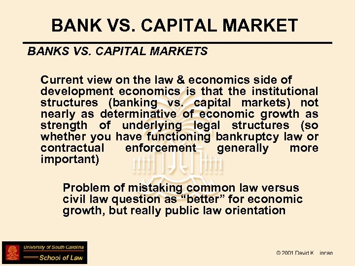 BANK VS. CAPITAL MARKET BANKS VS. CAPITAL MARKETS Current view on the law & economics side of development economics is that the institutional structures (banking vs. capital markets) not nearly as determinative of economic growth as strength of underlying legal structures (so whether you have functioning bankruptcy law or contractual enforcement generally more important) Problem of mistaking common law versus civil law question as “better” for economic growth, but really public law orientation