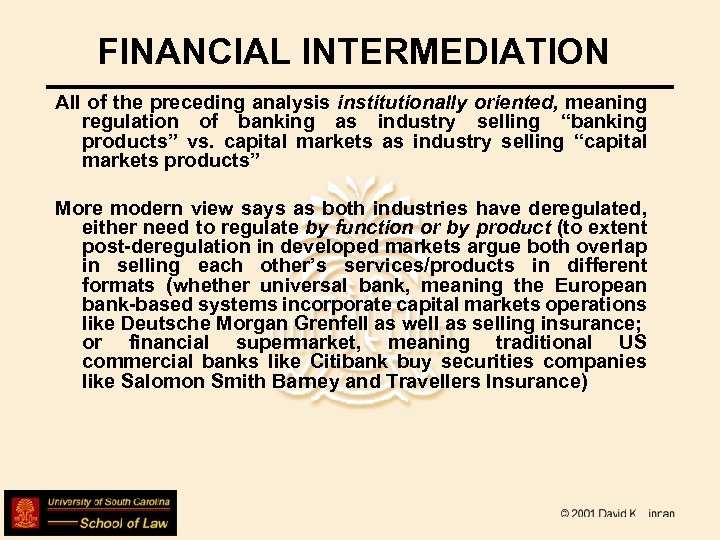 FINANCIAL INTERMEDIATION All of the preceding analysis institutionally oriented, meaning regulation of banking as industry selling “banking products” vs. capital markets as industry selling “capital markets products” More modern view says as both industries have deregulated, either need to regulate by function or by product (to extent post-deregulation in developed markets argue both overlap in selling each other’s services/products in different formats (whether universal bank, meaning the European bank-based systems incorporate capital markets operations like Deutsche Morgan Grenfell as well as selling insurance; or financial supermarket, meaning traditional US commercial banks like Citibank buy securities companies like Salomon Smith Barney and Travellers Insurance)