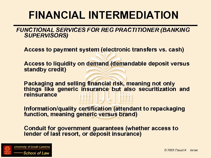 FINANCIAL INTERMEDIATION FUNCTIONAL SERVICES FOR REG PRACTITIONER (BANKING SUPERVISORS) Access to payment system (electronic transfers vs. cash) Access to liquidity on demand (demandable deposit versus standby credit) Packaging and selling financial risk, meaning not only things like generic insurance but also securitization and reinsurance Information/quality certification (attendant to repackaging function, meaning generic versus brand) Conduit for government guarantees (whether access to lender of last resort, or deposit insurance)