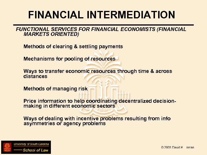 FINANCIAL INTERMEDIATION FUNCTIONAL SERVICES FOR FINANCIAL ECONOMISTS (FINANCIAL MARKETS ORIENTED) Methods of clearing & settling payments Mechanisms for pooling of resources Ways to transfer economic resources through time & across distances Methods of managing risk Price information to help coordinating decentralized decisionmaking in different economic sectors Ways of dealing with incentive problems resulting from info asymmetries or agency problems