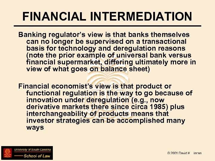 FINANCIAL INTERMEDIATION Banking regulator’s view is that banks themselves can no longer be supervised on a transactional basis for technology and deregulation reasons (note the prior example of universal bank versus financial supermarket, differing ultimately more in view of what goes on balance sheet) Financial economist’s view is that product or functional regulation is the way to go because of innovation under deregulation (e. g. , now derivative markets there since circa 1985) plus interchangeability of products means that investor strategies can be accomplished many ways