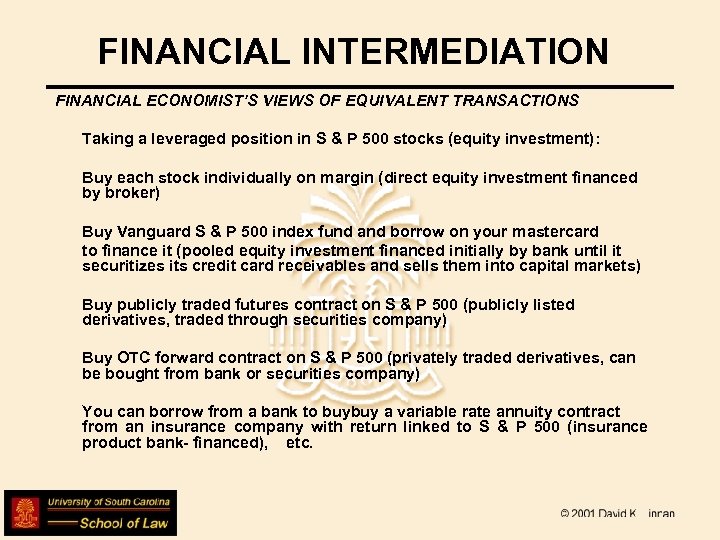 FINANCIAL INTERMEDIATION FINANCIAL ECONOMIST’S VIEWS OF EQUIVALENT TRANSACTIONS Taking a leveraged position in S & P 500 stocks (equity investment): Buy each stock individually on margin (direct equity investment financed by broker) Buy Vanguard S & P 500 index fund and borrow on your mastercard to finance it (pooled equity investment financed initially by bank until it securitizes its credit card receivables and sells them into capital markets) Buy publicly traded futures contract on S & P 500 (publicly listed derivatives, traded through securities company) Buy OTC forward contract on S & P 500 (privately traded derivatives, can be bought from bank or securities company) You can borrow from a bank to buybuy a variable rate annuity contract from an insurance company with return linked to S & P 500 (insurance product bank- financed), etc.
