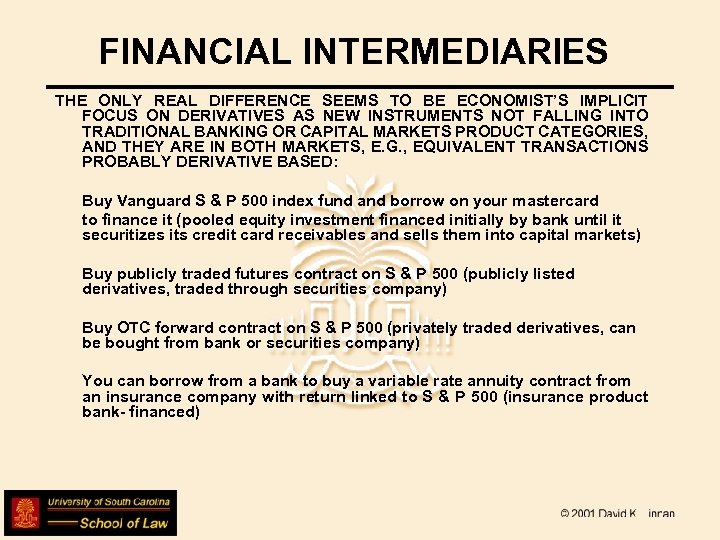 FINANCIAL INTERMEDIARIES THE ONLY REAL DIFFERENCE SEEMS TO BE ECONOMIST’S IMPLICIT FOCUS ON DERIVATIVES AS NEW INSTRUMENTS NOT FALLING INTO TRADITIONAL BANKING OR CAPITAL MARKETS PRODUCT CATEGORIES, AND THEY ARE IN BOTH MARKETS, E. G. , EQUIVALENT TRANSACTIONS PROBABLY DERIVATIVE BASED: Buy Vanguard S & P 500 index fund and borrow on your mastercard to finance it (pooled equity investment financed initially by bank until it securitizes its credit card receivables and sells them into capital markets) Buy publicly traded futures contract on S & P 500 (publicly listed derivatives, traded through securities company) Buy OTC forward contract on S & P 500 (privately traded derivatives, can be bought from bank or securities company) You can borrow from a bank to buy a variable rate annuity contract from an insurance company with return linked to S & P 500 (insurance product bank- financed)
