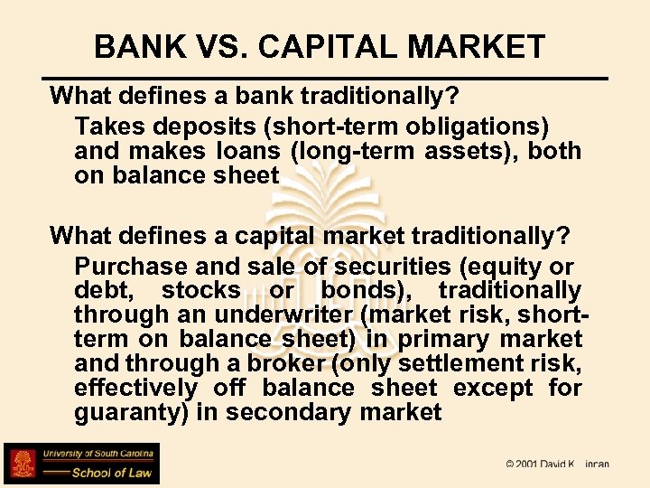 BANK VS. CAPITAL MARKET What defines a bank traditionally? Takes deposits (short-term obligations) and makes loans (long-term assets), both on balance sheet What defines a capital market traditionally? Purchase and sale of securities (equity or debt, stocks or bonds), traditionally through an underwriter (market risk, shortterm on balance sheet) in primary market and through a broker (only settlement risk, effectively off balance sheet except for guaranty) in secondary market