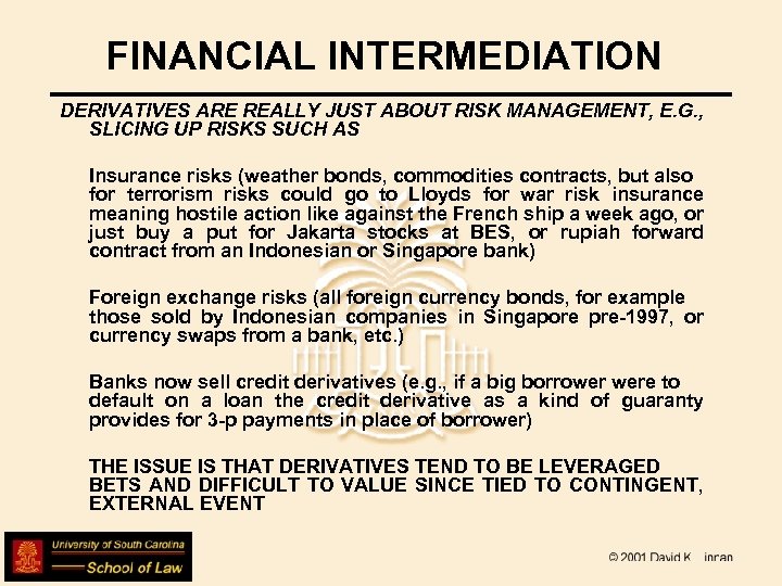 FINANCIAL INTERMEDIATION DERIVATIVES ARE REALLY JUST ABOUT RISK MANAGEMENT, E. G. , SLICING UP RISKS SUCH AS Insurance risks (weather bonds, commodities contracts, but also for terrorism risks could go to Lloyds for war risk insurance meaning hostile action like against the French ship a week ago, or just buy a put for Jakarta stocks at BES, or rupiah forward contract from an Indonesian or Singapore bank) Foreign exchange risks (all foreign currency bonds, for example those sold by Indonesian companies in Singapore pre-1997, or currency swaps from a bank, etc. ) Banks now sell credit derivatives (e. g. , if a big borrower were to default on a loan the credit derivative as a kind of guaranty provides for 3 -p payments in place of borrower) THE ISSUE IS THAT DERIVATIVES TEND TO BE LEVERAGED BETS AND DIFFICULT TO VALUE SINCE TIED TO CONTINGENT, EXTERNAL EVENT
