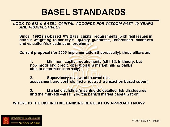 BASEL STANDARDS LOOK TO BIS & BASEL CAPITAL ACCORDS FOR WISDOM PAST 10 YEARS AND PROSPECTIVELY Since 1992 risk-based 8% Basel capital requirements, with real issues in haircut weighting (older style liquidity guarantee, unforeseen incentives and valuation/risk estimation problems) Current proposal (for 2006 implementation theoretically), three pillars are 1. Minimum capital requirements (still 8% in theory, but now modelling credit, operational & market risk w/ banks able to determine internally) 2. Supervisory review, of internal risk assessment and controls (note not trad. transaction based super. ) 3. Market discipline (meaning do detailed risk disclosures and the markets will tell you the bank’s market capitalization) WHERE IS THE DISTINCTIVE BANKING REGULATION APPROACH NOW?