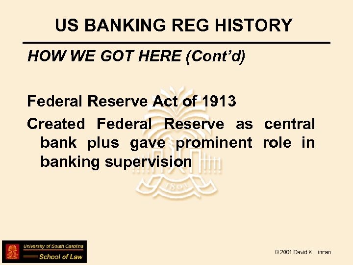 US BANKING REG HISTORY HOW WE GOT HERE (Cont’d) Federal Reserve Act of 1913 Created Federal Reserve as central bank plus gave prominent role in banking supervision