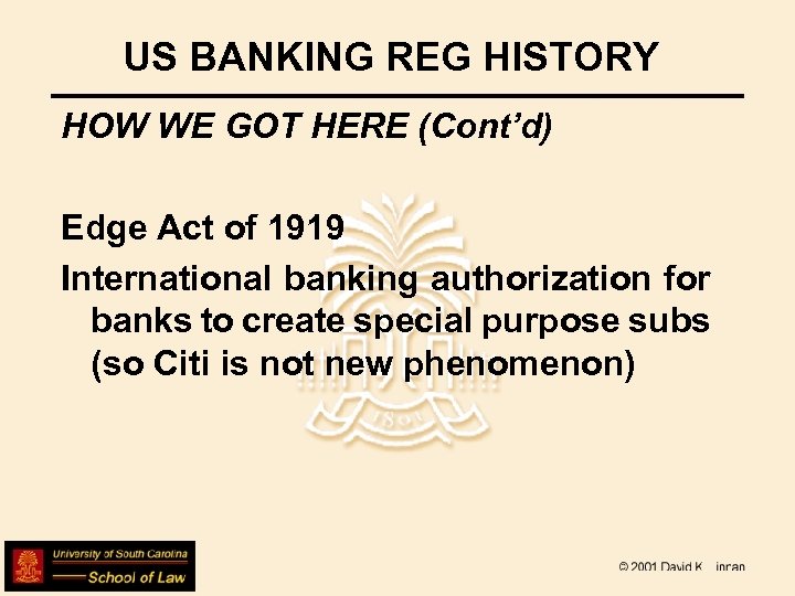 US BANKING REG HISTORY HOW WE GOT HERE (Cont’d) Edge Act of 1919 International banking authorization for banks to create special purpose subs (so Citi is not new phenomenon)