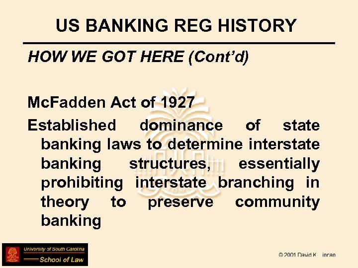 US BANKING REG HISTORY HOW WE GOT HERE (Cont’d) Mc. Fadden Act of 1927 Established dominance of state banking laws to determine interstate banking structures, essentially prohibiting interstate branching in theory to preserve community banking