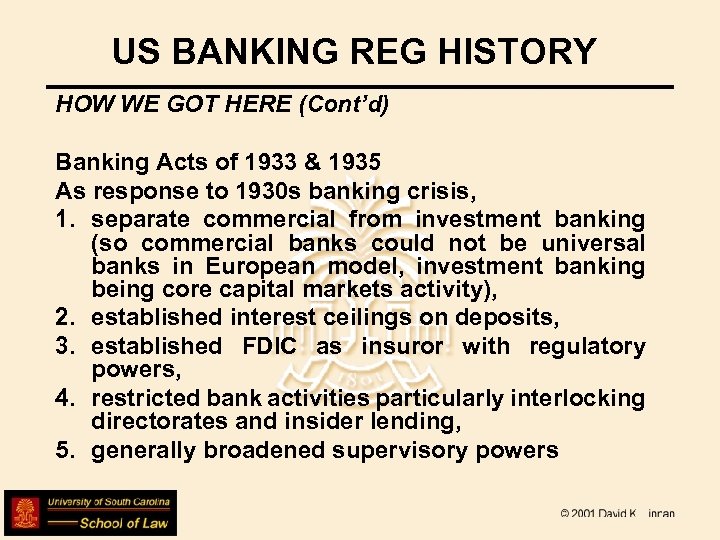 US BANKING REG HISTORY HOW WE GOT HERE (Cont’d) Banking Acts of 1933 & 1935 As response to 1930 s banking crisis, 1. separate commercial from investment banking (so commercial banks could not be universal banks in European model, investment banking being core capital markets activity), 2. established interest ceilings on deposits, 3. established FDIC as insuror with regulatory powers, 4. restricted bank activities particularly interlocking directorates and insider lending, 5. generally broadened supervisory powers