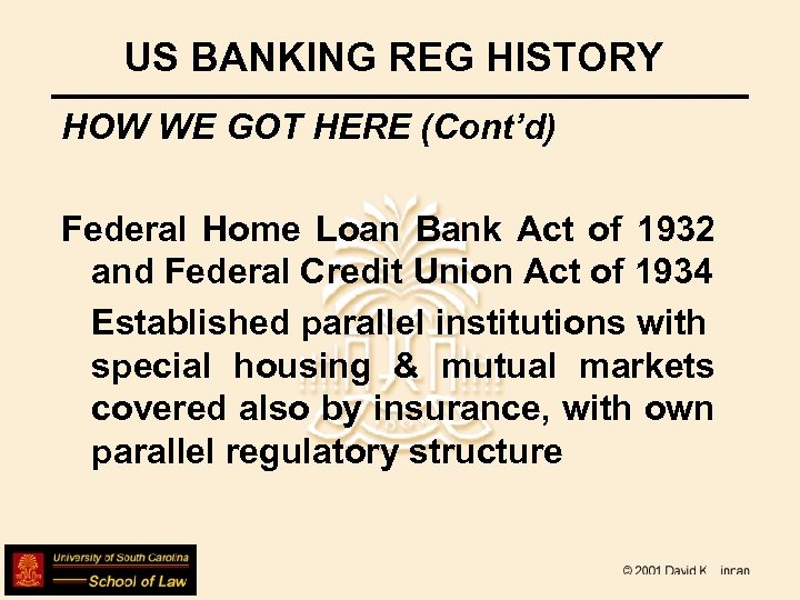 US BANKING REG HISTORY HOW WE GOT HERE (Cont’d) Federal Home Loan Bank Act of 1932 and Federal Credit Union Act of 1934 Established parallel institutions with special housing & mutual markets covered also by insurance, with own parallel regulatory structure