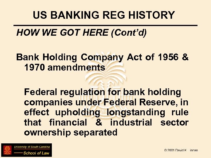 US BANKING REG HISTORY HOW WE GOT HERE (Cont’d) Bank Holding Company Act of 1956 & 1970 amendments Federal regulation for bank holding companies under Federal Reserve, in effect upholding longstanding rule that financial & industrial sector ownership separated