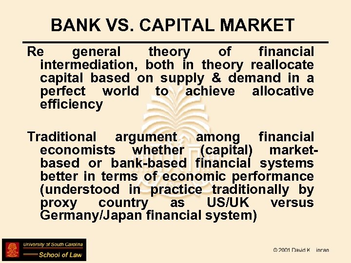 BANK VS. CAPITAL MARKET Re general theory of financial intermediation, both in theory reallocate capital based on supply & demand in a perfect world to achieve allocative efficiency Traditional argument among financial economists whether (capital) marketbased or bank-based financial systems better in terms of economic performance (understood in practice traditionally by proxy country as US/UK versus Germany/Japan financial system)