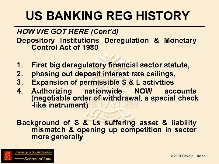 US BANKING REG HISTORY HOW WE GOT HERE (Cont’d) Depository Institutions Deregulation & Monetary Control Act of 1980 1. 2. 3. 4. First big deregulatory financial sector statute, phasing out deposit interest rate ceilings, Expansion of permissible S & L activtties Authorizing nationwide NOW accounts (negotiable order of withdrawal, a special check -like instrument) Background of S & Ls suffering asset & liability mismatch & opening up competition in sector more generally