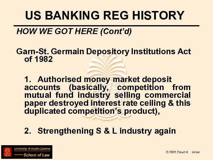 US BANKING REG HISTORY HOW WE GOT HERE (Cont’d) Garn-St. Germain Depository Institutions Act of 1982 1. Authorised money market deposit accounts (basically, competition from mutual fund industry selling commercial paper destroyed interest rate ceiling & this duplicated competition’s product), 2. Strengthening S & L industry again