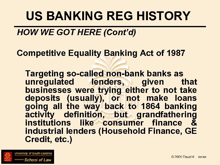 US BANKING REG HISTORY HOW WE GOT HERE (Cont’d) Competitive Equality Banking Act of 1987 Targeting so-called non-banks as unregulated lenders, given that businesses were trying either to not take deposits (usually), or not make loans going all the way back to 1864 banking activity definition, but grandfathering institutions like consumer finance & industrial lenders (Household Finance, GE Credit, etc. )