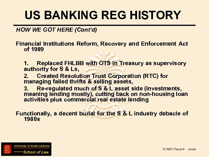 US BANKING REG HISTORY HOW WE GOT HERE (Cont’d) Financial Institutions Reform, Recovery and Enforcement Act of 1989 1. Replaced FHLBB with OTS in Treasury as supervisory authority for S & Ls, 2. Created Resolution Trust Corporation (RTC) for managing failed thrifts & selling assets, 3. Re-regulated much of S & L asset side (investments, meaning lending mostly), cutting back on non-housing loan activities plus commercial real estate lending Functionally, a decent burial for the S & L industry debacle of 1980 s