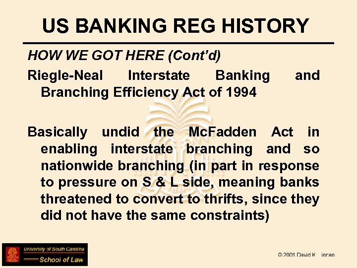 US BANKING REG HISTORY HOW WE GOT HERE (Cont’d) Riegle-Neal Interstate Banking Branching Efficiency Act of 1994 and Basically undid the Mc. Fadden Act in enabling interstate branching and so nationwide branching (in part in response to pressure on S & L side, meaning banks threatened to convert to thrifts, since they did not have the same constraints)