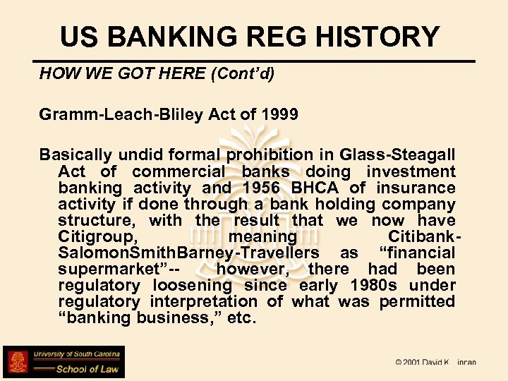 US BANKING REG HISTORY HOW WE GOT HERE (Cont’d) Gramm-Leach-Bliley Act of 1999 Basically undid formal prohibition in Glass-Steagall Act of commercial banks doing investment banking activity and 1956 BHCA of insurance activity if done through a bank holding company structure, with the result that we now have Citigroup, meaning Citibank. Salomon. Smith. Barney-Travellers as “financial supermarket”-however, there had been regulatory loosening since early 1980 s under regulatory interpretation of what was permitted “banking business, ” etc.