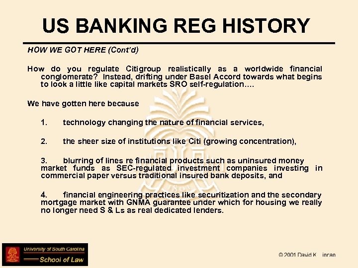 US BANKING REG HISTORY HOW WE GOT HERE (Cont’d) How do you regulate Citigroup realistically as a worldwide financial conglomerate? Instead, drifting under Basel Accord towards what begins to look a little like capital markets SRO self-regulation…. We have gotten here because 1. technology changing the nature of financial services, 2. the sheer size of institutions like Citi (growing concentration), 3. blurring of lines re financial products such as uninsured money market funds as SEC-regulated investment companies investing in commercial paper versus traditional insured bank deposits, and 4. financial engineering practices like securitization and the secondary mortgage market with GNMA guarantee under which for housing we really no longer need S & Ls as real dedicated lenders.