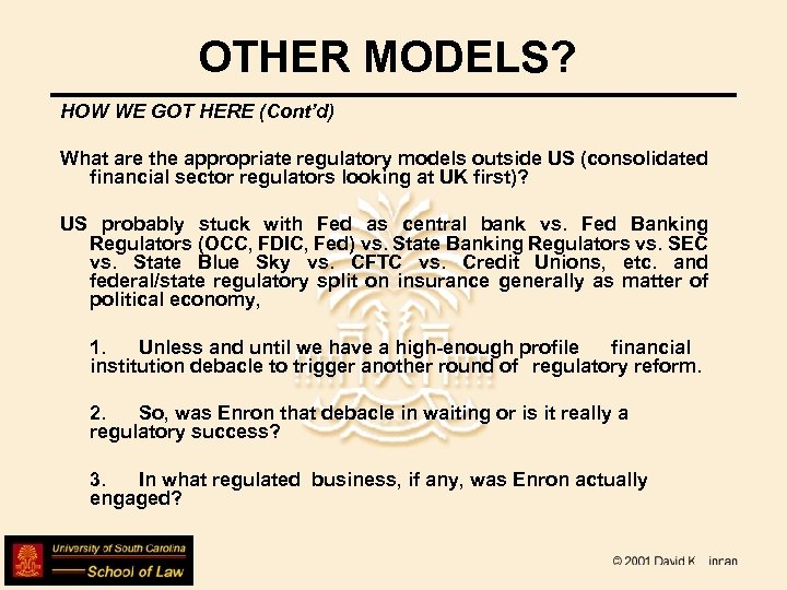 OTHER MODELS? HOW WE GOT HERE (Cont’d) What are the appropriate regulatory models outside US (consolidated financial sector regulators looking at UK first)? US probably stuck with Fed as central bank vs. Fed Banking Regulators (OCC, FDIC, Fed) vs. State Banking Regulators vs. SEC vs. State Blue Sky vs. CFTC vs. Credit Unions, etc. and federal/state regulatory split on insurance generally as matter of political economy, 1. Unless and until we have a high-enough profile financial institution debacle to trigger another round of regulatory reform. 2. So, was Enron that debacle in waiting or is it really a regulatory success? 3. In what regulated business, if any, was Enron actually engaged?