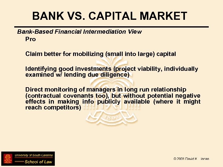 BANK VS. CAPITAL MARKET Bank-Based Financial Intermediation View Pro Claim better for mobilizing (small into large) capital Identifying good investments (project viability, individually examined w/ lending due diligence) Direct monitoring of managers in long run relationship (contractual covenants too), but without potential negative effects in making info publicly available (where it might reach competitors)