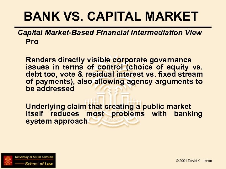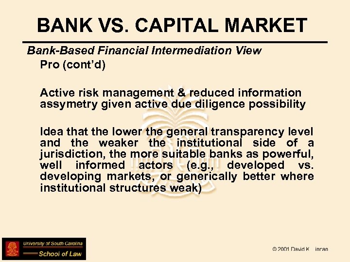 BANK VS. CAPITAL MARKET Bank-Based Financial Intermediation View Pro (cont’d) Active risk management & reduced information assymetry given active due diligence possibility Idea that the lower the general transparency level and the weaker the institutional side of a jurisdiction, the more suitable banks as powerful, well informed actors (e. g. , developed vs. developing markets, or generically better where institutional structures weak)