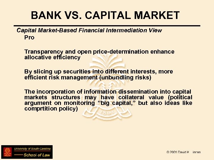 BANK VS. CAPITAL MARKET Capital Market-Based Financial Intermediation View Pro Transparency and open price-determination enhance allocative efficiency By slicing up securities into different interests, more efficient risk management (unbundling risks) The incorporation of information dissemination into capital markets structures may have collateral value (political argument on monitoring “big capital, ” but also ideas like comprtition policy)