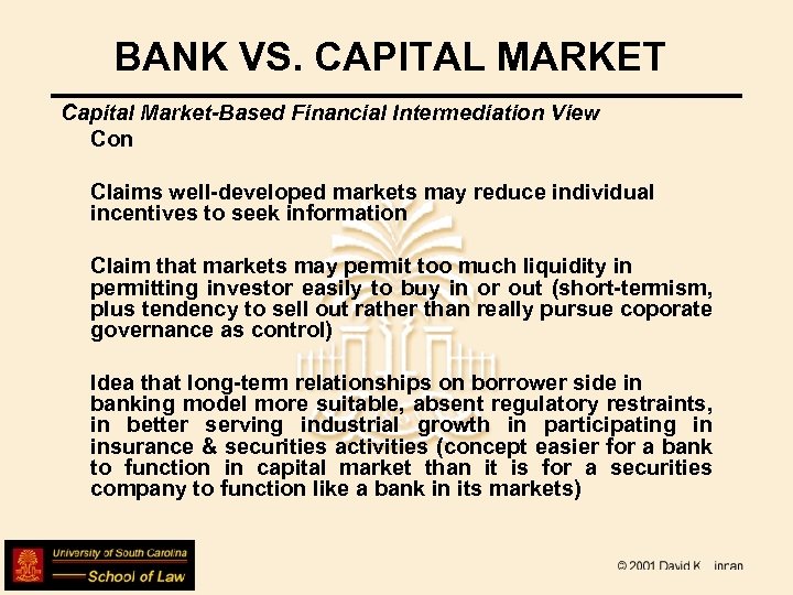 BANK VS. CAPITAL MARKET Capital Market-Based Financial Intermediation View Con Claims well-developed markets may reduce individual incentives to seek information Claim that markets may permit too much liquidity in permitting investor easily to buy in or out (short-termism, plus tendency to sell out rather than really pursue coporate governance as control) Idea that long-term relationships on borrower side in banking model more suitable, absent regulatory restraints, in better serving industrial growth in participating in insurance & securities activities (concept easier for a bank to function in capital market than it is for a securities company to function like a bank in its markets)