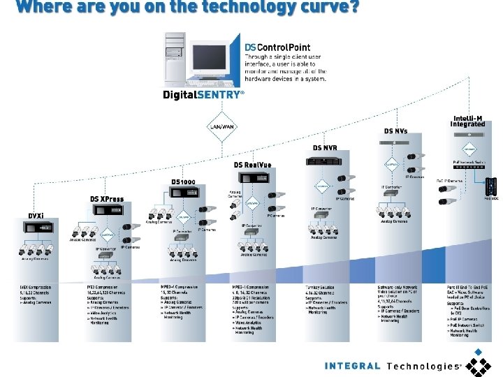 Integral Video Product Lines • Integral has two video product lines: – DVX • Based on Master. Control Software • Max of One IVEX Compression Card – Digital. SENTRY (DS) • • Based on Digital. SENTRY Software Support Up to 4 Compression Cards Support Hybrid Configuration up to 16 IP Cameras DS IT Centric Software Suite • Integral supports multiple video compression algorithms: – IVEX (Integral Proprietary) – MPEG 4 – IP Camera Specific